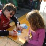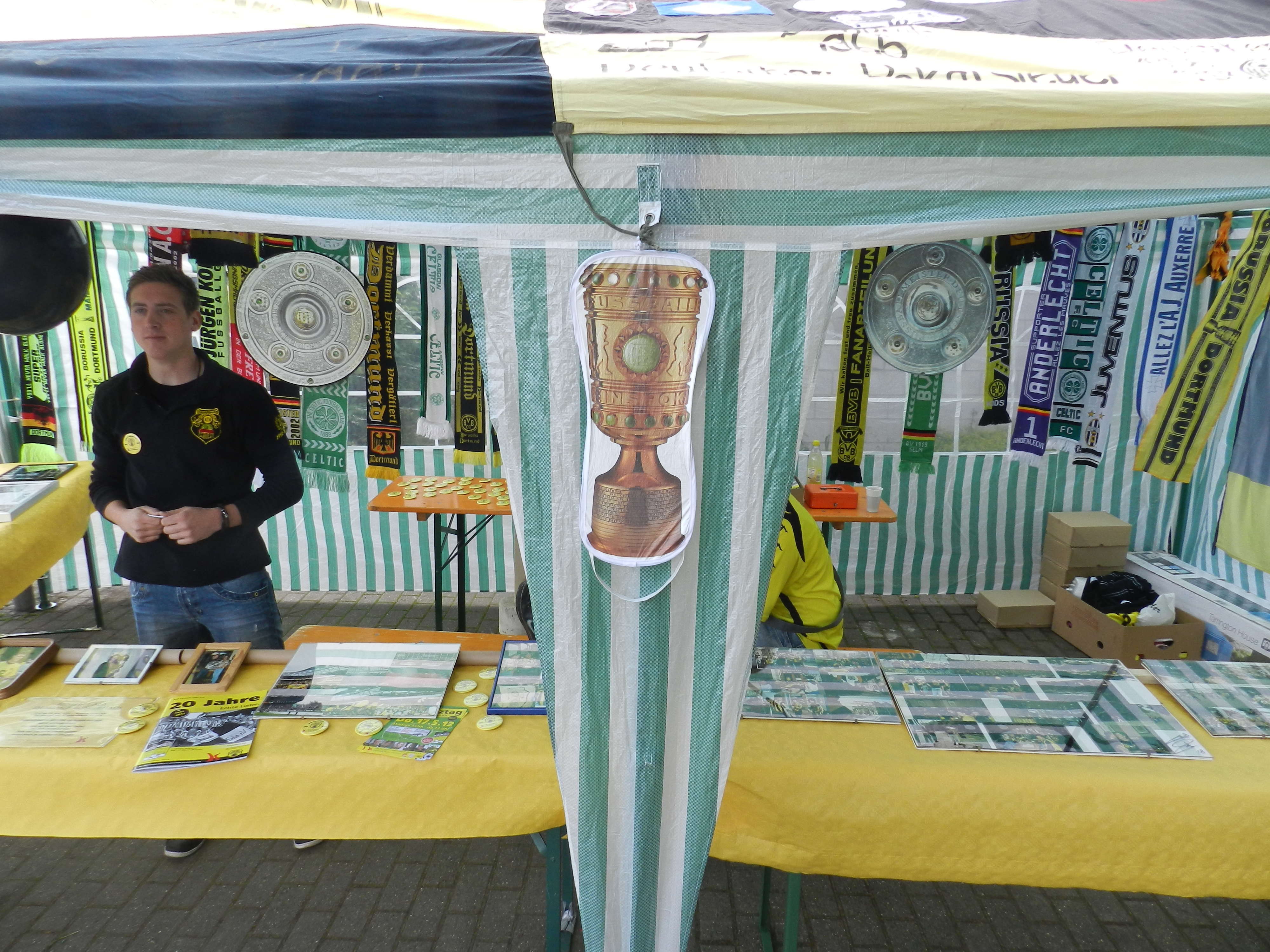 Am 17. und 18. Mai 2012 richteten wir anlässlich unseres zwanzigjährigen Jubiläums eine Benefiztagveranstaltung zugunsten von Kinderlachen e.V. aus. Am 17. Mai 2012 ging es für uns also ab ins Selmer Stadion. Neben zahlreichen Mitmachaktionen für die Kleinen, Kaltgetränken für die Großen, Tombola und vielem mehr, war jedoch das Fußballspiel zwischen der SG 2010 Selm und den Kinderlachen-Stars and Friends e.V. das Highlight des Tages. Für die Mannschaft von Kinderlachen spielten u. a. Lothar Sippel, Thomas Ernst oder auch Matze Knop, der auch außerhalb des Platzes am Mikrofon als Kult-Kloppo, Kaiser und Co. die Zuschauer mit seinen Kommentaren zum Spiel begeistern konnte. Im Vordergrund stand natürlich der gute Zweck, verbunden mit einer Menge Spaß – und doch war es ein schönes Fußballspiel, das die Kinderlachen- Stars and Friends am Ende mit 7:3 für sich entscheiden konnten. Doch das wurde nur am Rande wahr genommen, denn nach dem Spiel stellten sich die Stars der wartenden Menge und schrieben zahlreiche Autogramme oder erfüllten nahezu alle Fotowünsche der Fans. „Star des Tages“ war jedoch jemand anderes: Emma! Kaum war die plüschige Riesen-Biene im Selmer Stadion angekommen, war sie auch schon von allen Seiten von kleinen und großen BVB-Fans umzingelt und alsbald eingeschlossen. Emma nahm sich ausgiebig Zeit für ihre Fans und erfüllte so gut es ging die zahlreichen Wünsche ihrer Fans. Doch leider war die Zeit des Maskottchens recht knapp bemessen und so nahm man Abschied und widmete sich mit den anderen Zuschauern wieder anderen Dingen. Matthias „Kasche“ Kartner zum Beispiel. Der performte auf dem Grün des Stadions „You´ll never walk alone“ und so manch einem bescherte er damit ein Gänsehautgefühl. Am Ende des Tages sah man die fleißigen Fanclub-Mitglieder entweder gestresst oder glückselig Lächeln – was bei dem Aufwand auf der einen Seite und dem Erfolg auf der anderen durchaus verständlich war. Sie machten den Tag für alle Anwesenden zu etwas Besonderem und durften sich über mehr als 2.000 Zuschauer freuen. Und so konnte man in gemütlicher Runde den Tag mit einem überaus positiven Fazit ausklingen lassen.