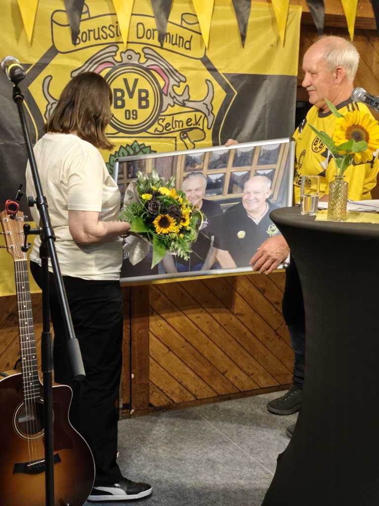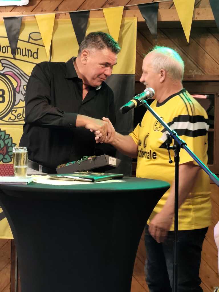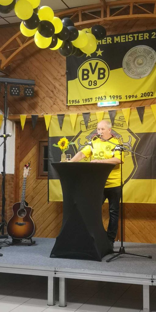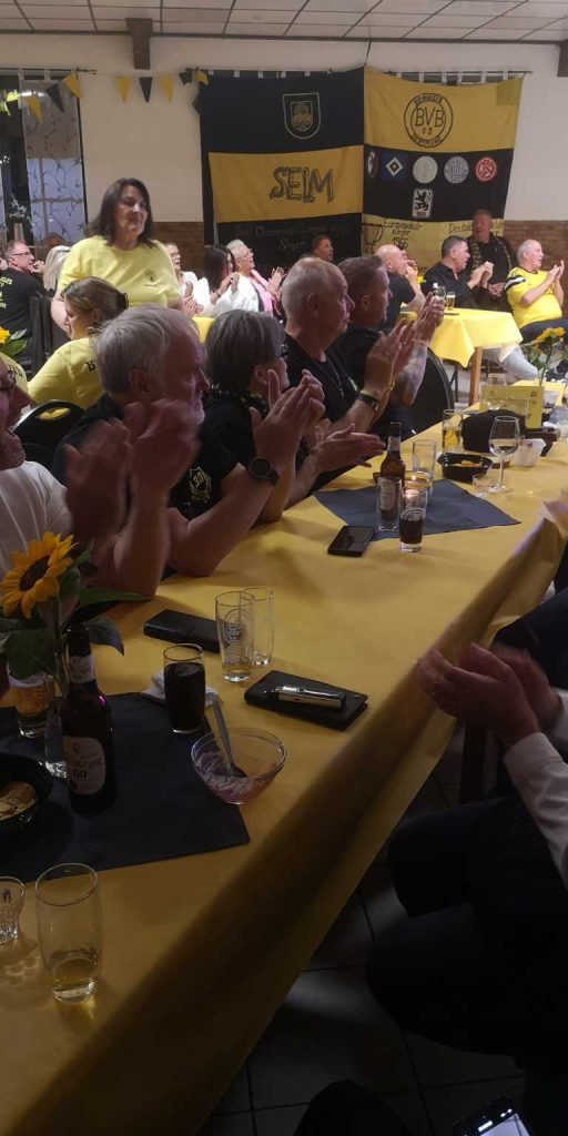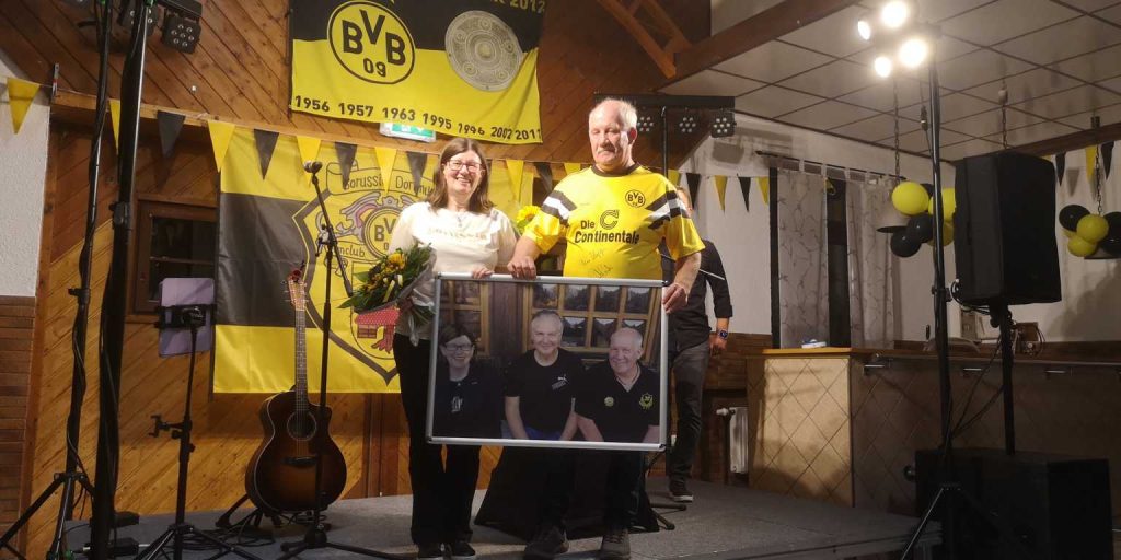 Ein weiterer besonderer Moment war die Begrüßung der geladenen Gäste, unter anderem Petra Strüker und Günter „Kutte“ Kutowski, die beiden BVB-Fanbeauftragten, die dem Fanclub bereits seit vielen Jahren eng verbunden sind. „Kappi“ überreichte Petra Strüker ein Erinnerungsbild, das sie gemeinsam mit dem verstorbenen Wolfgang „Teddy“ de Beer zeigt, ein rührender Moment, der die Verbundenheit und den Verlust innerhalb der BVB-Familie unterstrich. Petra dankte dem Fanclub für die langjährige und vertrauensvolle Zusammenarbeit, dieses Lob konnte der 1. Vorsitzende des Fanclubs nur erwidern.