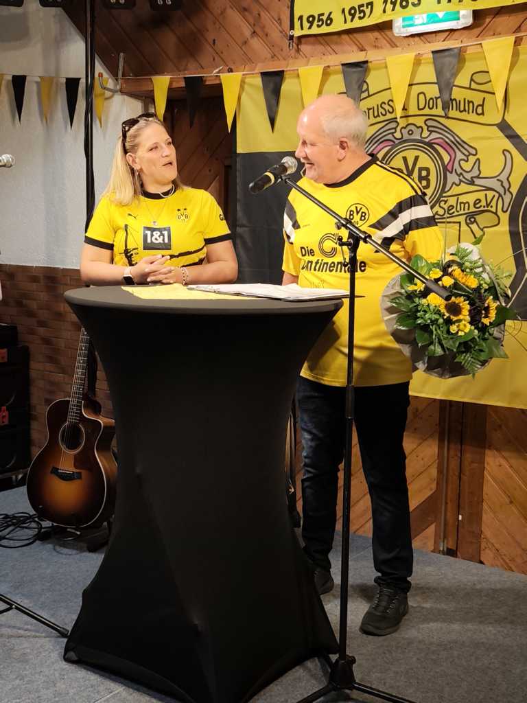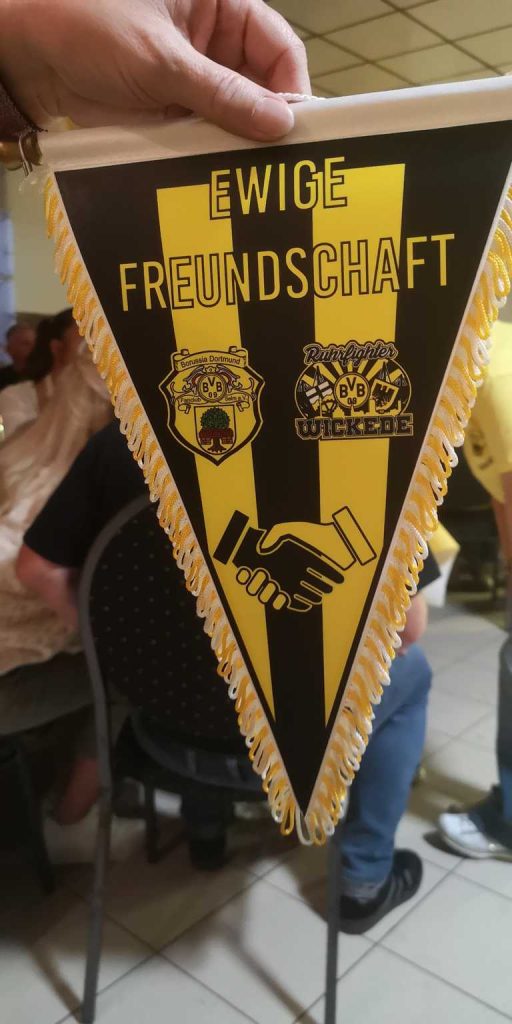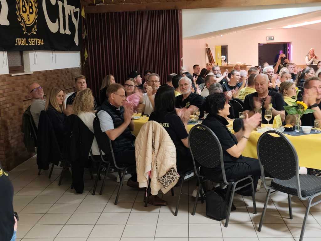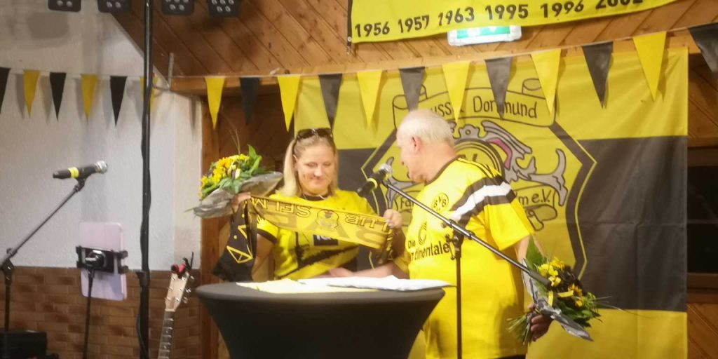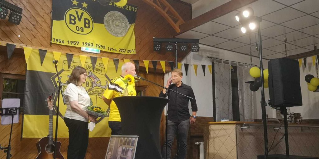Ein weiterer besonderer Moment war die Begrüßung der geladenen Gäste, unter anderem Petra Strüker und Günter „Kutte“ Kutowski, die beiden BVB-Fanbeauftragten, die dem Fanclub bereits seit vielen Jahren eng verbunden sind. „Kappi“ überreichte Petra Strüker ein Erinnerungsbild, das sie gemeinsam mit dem verstorbenen Wolfgang „Teddy“ de Beer zeigt, ein rührender Moment, der die Verbundenheit und den Verlust innerhalb der BVB-Familie unterstrich. Petra dankte dem Fanclub für die langjährige und vertrauensvolle Zusammenarbeit, dieses Lob konnte der 1. Vorsitzende des Fanclubs nur erwidern.