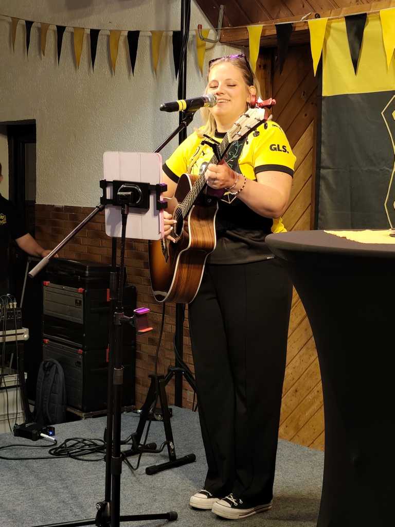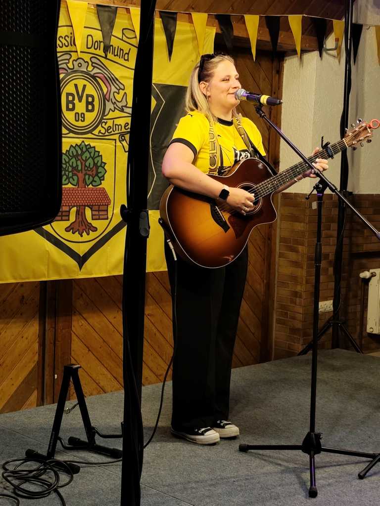 Für die perfekte musikalische Untermalung sorgte die Sängerin Jo Marie Dominiak. Mit ihrer einzigartigen Stimme und ihren gefühlvollen BVB-Liedern zog sie die Borussen in ihren Bann. Jo Marie, die schon als Kind im Fanblock stand, ist eine echte Dortmunderin und hat sich mit ihren Songs wie „Am Borsigplatz geboren“ und „Leuchte auf, mein Stern Borussia“ einen Namen in der BVB-Fanwelt gemacht. Ihre tiefe Verbundenheit zum Verein war auf der Bühne spürbar und machte ihren Auftritt zu einem unvergesslichen Erlebnis. Ihre Darbietungen, die von traditionellen BVB-Hymnen bis hin zu emotionalen Momenten reichten, brachten die Fans und Freunde des Fanclubs in eine wahre „schwarz-gelbe“ Euphorie.