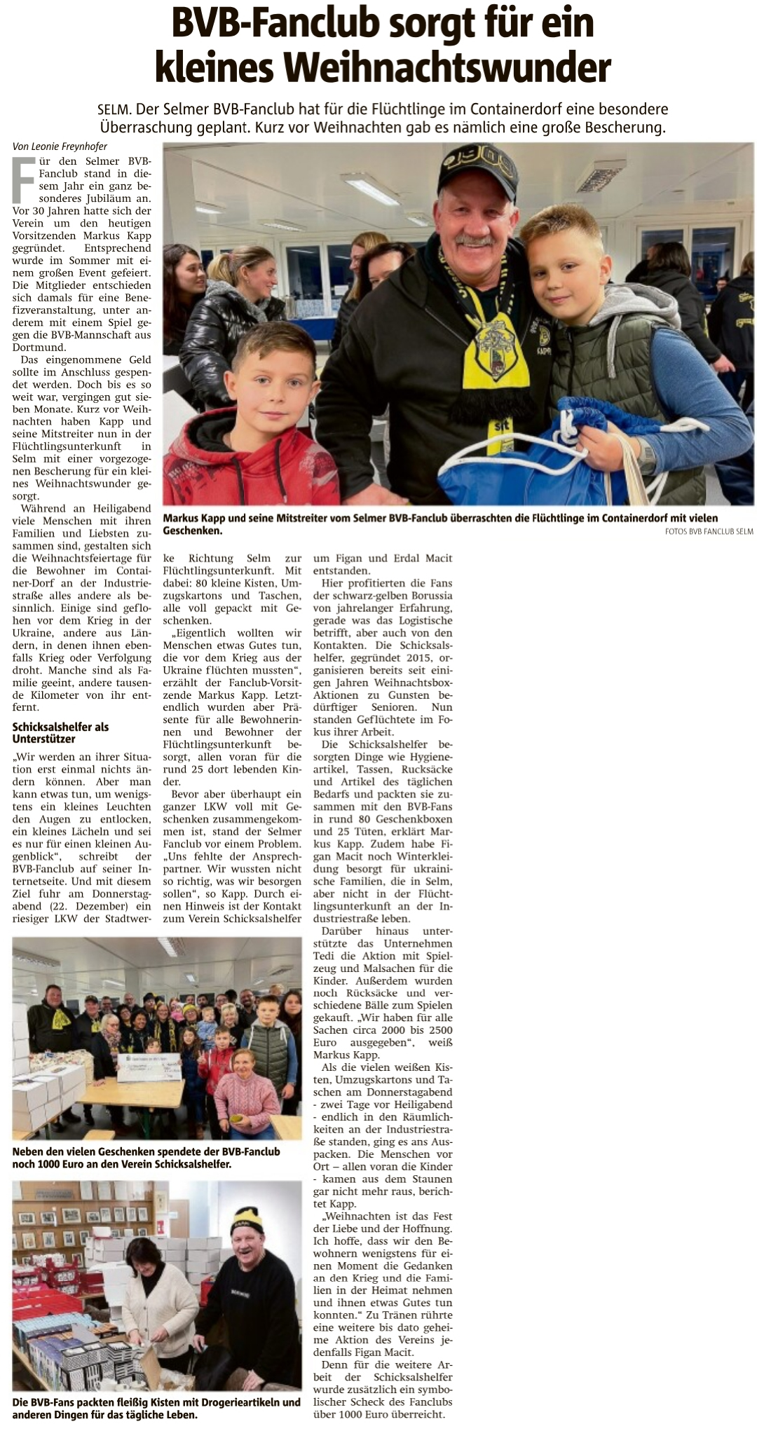 Leuchtende Kinderaugen und lachende Gesichter in einer sonst so tristen Zeit. Die Bewohner der Flüchtlingsunterkunft an der Industriestraße erlebten am Donnerstagabend eine vorgezogene Bescherung. Die Mitglieder des BVB-Fanclubs waren mit einem LKW vorgefahren. 30 Jahre BVB Fanclub Selm hatte es im Sommer gehei...